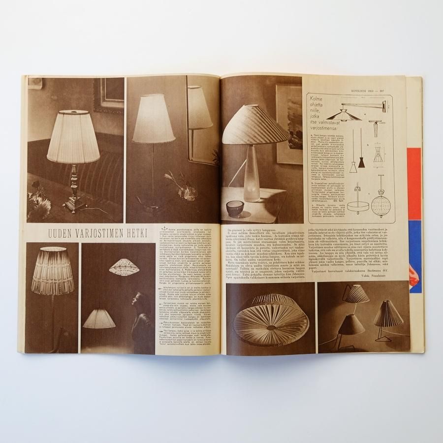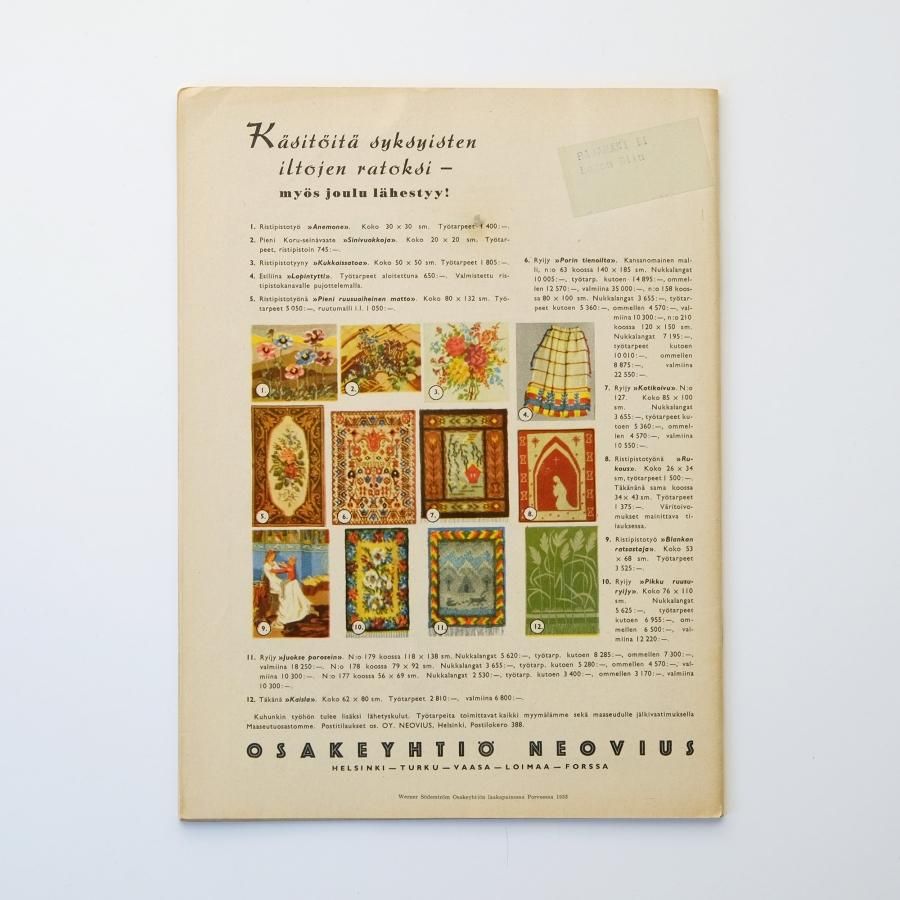 インテリア、手工芸、レシピ、ファッション、季節の行事や子育てなど、当時のフィンランドの生活が楽しめる他、レトロデザインの広告も魅力です。ソコスデパートやアラビアなどの企業やブランドの懐かしい記事や広告も。(一部カラー)