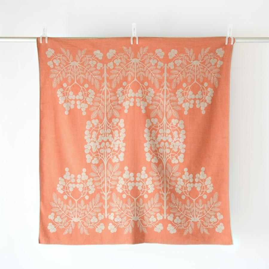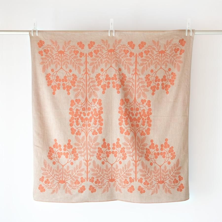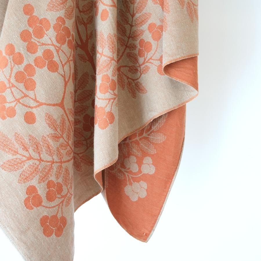 Leena Korpinenによりデザインされたハーフリネン・ダマスク織りのテーブルクロス「Pihlajanmarja(セイヨウナナカマド)」。1970-80年にフィンランド、タンペラ社で生産されました。